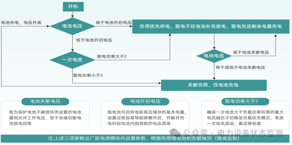因供電負(fù)荷的變化線纜電流波動很大,在一次電流過低時甚至無法帶動負(fù)載正常工作,因此電流感應(yīng)取電大多配置儲能電池,大電流時電池儲能,小電流時電池放電,以實現(xiàn)用電負(fù)載最大的在線工作率,且設(shè)備均戶外安裝運行環(huán)境惡劣,在一次電流寬幅波動情況下的專業(yè)電池充放電控制和管理尤為重要,好的設(shè)計不僅能提升設(shè)備在線率,延長電池壽命,降低電池失效或故障起火的風(fēng)險,且還會避免負(fù)載頻繁重啟的打嗝現(xiàn)象。推薦奧博爾公司的下述充放電控制邏輯。
